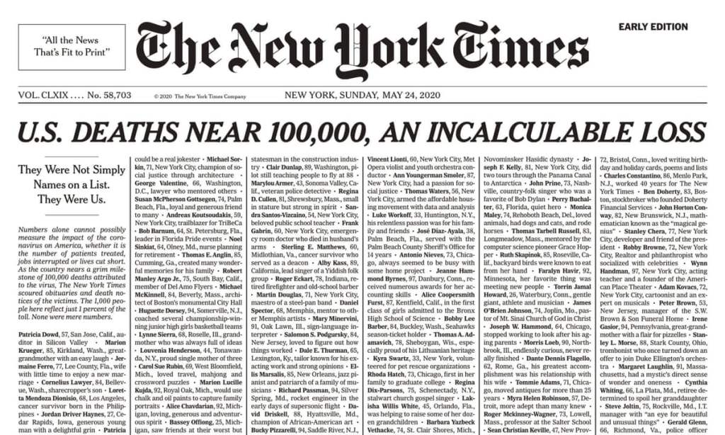 The United States is on the brink of passing the 100,000 victim mark today or tomorrow. I cannot imagine our national leadership calling for an official period of mourning in our country as we pass this milestone. In almost every state, people are aggressively forgetting the reality of their continued vulnerability, encouraged by leaders at every level, leaders in government and leaders in religion.