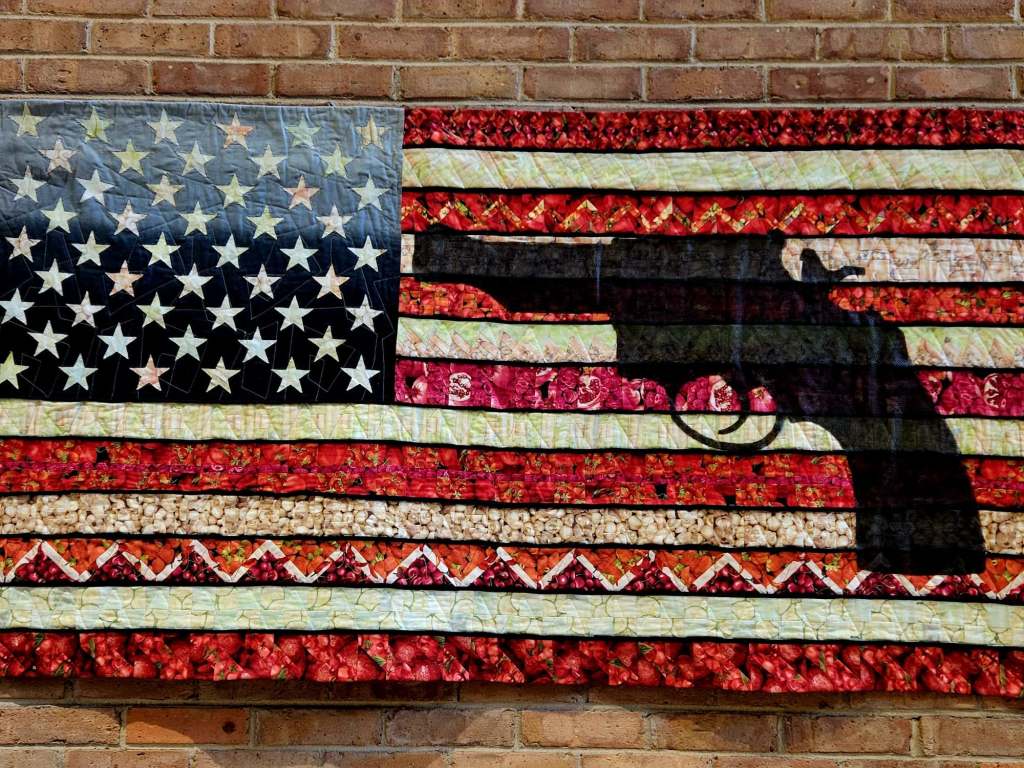 Readers may note in this blog post the absence of photos of the concert itself. It did not seem appropriate to shoot photos of or during the performance, although I share two that I took later and consider important. One shows the fabric art of Michele Makinen, who died of cancer earlier this year but lived in Chicago since 1974. “Guns: A Loaded Conversation” hung on the sanctuary wall, exhibiting the intricate workmanship Makinen brought to her response to the shooting of innocent children at Sandy Hook Elementary School in Newtown, Connecticut, in December 2012. The flag quilt became part of a traveling exhibit the following year.