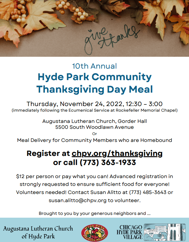Organized by the Chicago Hyde Park Village, hosted by Augustana and supported by Hyde Park Produce Market. Help is still needed – contact Susan at 773.485.3643 or susan.alitto@chpv.org to volunteer!