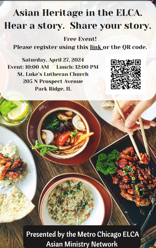 Please join Pastor Manoj Gunthoti at the Metro Chicago Synod’s Asian Ministry Network’s Heritage Event on Saturday, April 27, 2024 from 10:00 AM -12:00 PM. Join us for food and fellowship. Please send any questions to Aneel Trivedi (pastoraneel@messiahparkridge.org) and register at the QR code below or at this link https://docs.google.com/forms/d/e/1FAIpQLSfTHMqimWBl0idaAWM3lS3ma_KunCZgbMZWPlLhg1VwBbc1wg/viewform