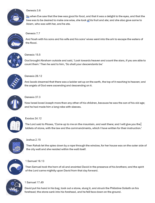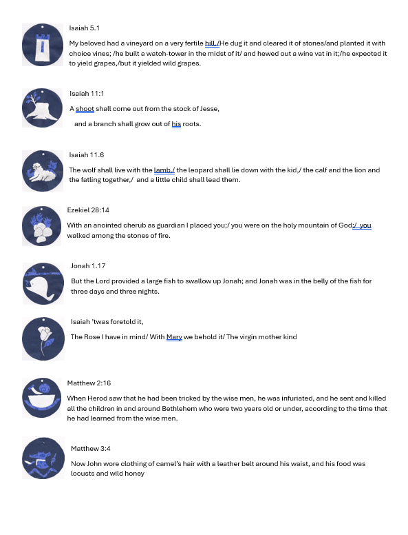 There is an evergreen tree in our nave, but for these weeks of Advent, it is decorated with blue bulbs and symbols. Each symbol reminds us of a story from our long spiritual ancestry of patriarchs, prophets and kings who came before Jesus. If you’d like to know more, the biblical book and the chapter and verse numbers can help you find more about each story.