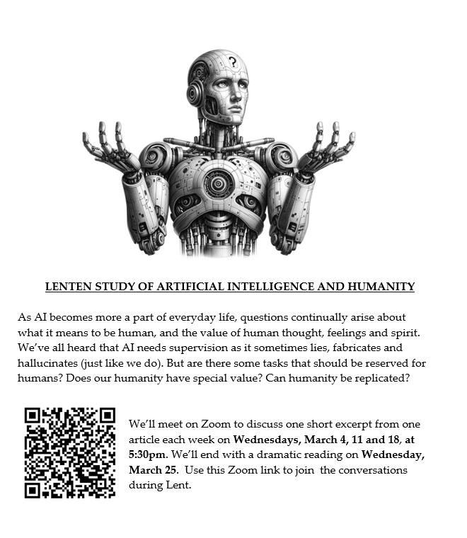 Lenten Study of Artificial Intelligence and Humanity Posted on February 25, 2026 by jimvondracek Share this: Share on X (Opens in new window) X Share on Facebook (Opens in new window) Facebook Like Loading...